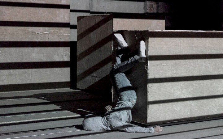 Tudo vibra: o palco de Anna Konjetzky está constantemente em movimento: os cubos se movem - às vezes muito lentamente e quase imperceptíveis, às vezes mais rápidos e em uma correria aparente, trocando imagens e formas inundando o espaço, modificando-o, tornando-o maior ou plano. No meio dele: o corpo de uma dançarina que precisa se afirmar contra, e com o espaço; que precisa se adaptar a circunstâncias constantemente novas e que precisa encontrar novos caminhos.